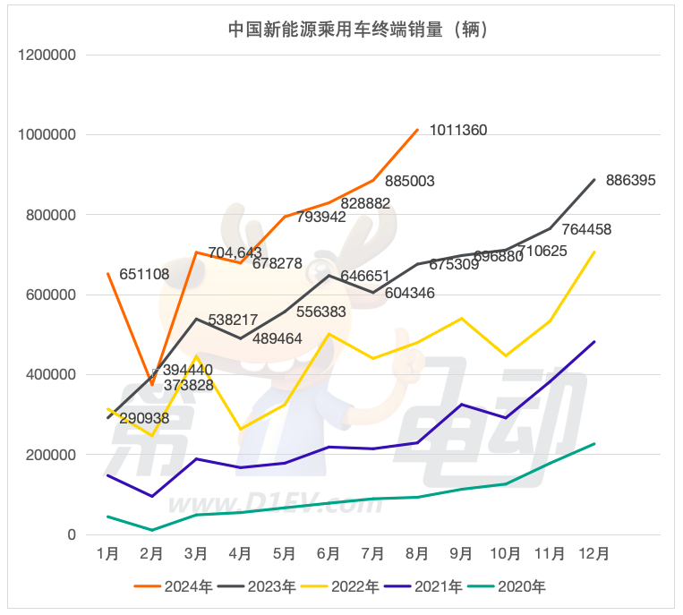 其中,新能源车终端销量首次突破100万辆,达1,011,360辆,环比上涨14.3%,同比大涨49.8%,渗透率达52.2%。8月中国新能源车终端销量和渗透率均创历史新高。