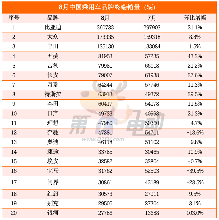 凭借9款超级爆款车,8月比亚迪终端销量超36万辆,环比大涨21%,再创历史新高。