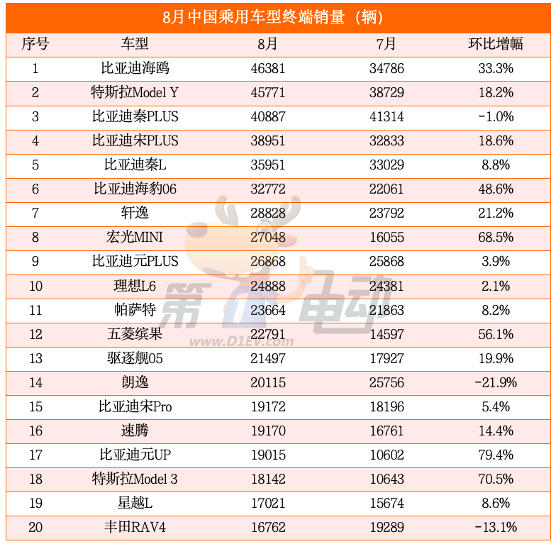 海豹06销量环比大涨48.6%,超越轩逸,位居第六。元PLUS销量微涨3.9%,排名继续下滑至第九。